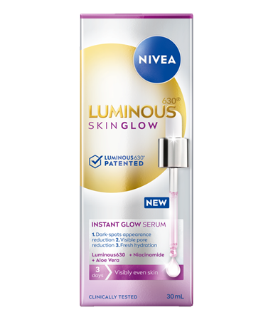 Experience the transformative power of NIVEA Luminous 630 range to give a youthful-looking glow to your skin. After 10 years of meticulous research, the range provides proven, continuous results of visibly reducing the look of dark spots and uneven skin tone in as little as 2 weeks.* After 12 weeks, dark spots look less intense and are visibly reduced by up to 71%.** Our patented technology has proven efficacy in targeting the root cause of the three major types of dark spots : sun exposure, aging, and dark under-eye circles. Featuring powerful ingredients such as hyaluronic acid that intensely hydrates and patented Luminous 630® that works to reduce the look of dark spots, the NIVEA Luminous 630 dark spot solution range features a face serum, a face cream, and an under eye cream, revitalizing the appearance for a brighter and more luminous looking complexion.