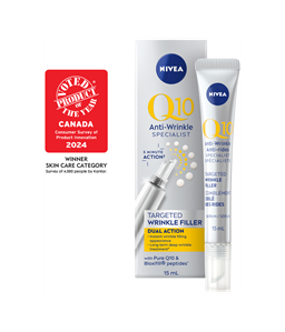 NIVEA Q10 Anti-Rides Spécialiste Comblement Ciblé des Rides a été élu Produit de l'année 2024 au Canada dans la catégorie des soins de la peau par Kantar*, et il est facile de comprendre pourquoi! Vous verrez l'action en 5 minutes** avec un comblement instantané des rides et un lissage des rides profondes***. Formulé avec des peptides Bioxifill®, ce produit de comblement ciblé des rides aide à réduire l'apparence des pattes d'oie, des sillons nasogéniens, des rides des lèvres et des rides du front, vous laissant une peau radieuse et d'apparence saine.