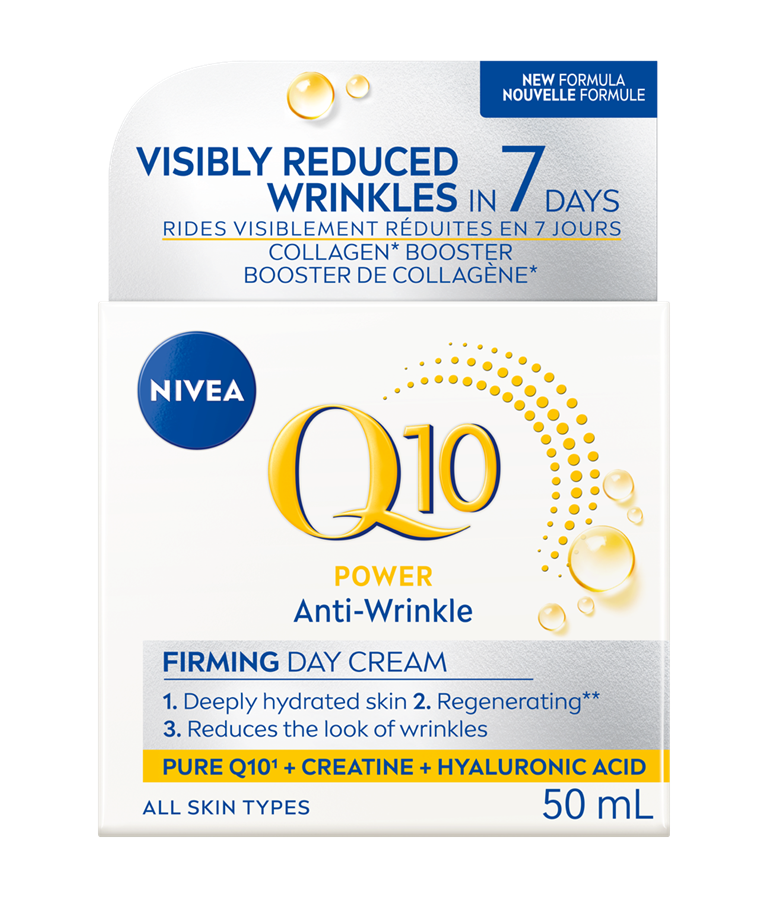La CRÈME DE JOUR RAFFERMISSANTE NIVEA Q10 POWER associe de la coenzyme Q10 pure à de la créatine et de l’acide hyaluronique pour réduire visiblement l’apparence des rides en 7 jours, tout en offrant une sensation de peau plus ferme et une hydratation profonde et intense.