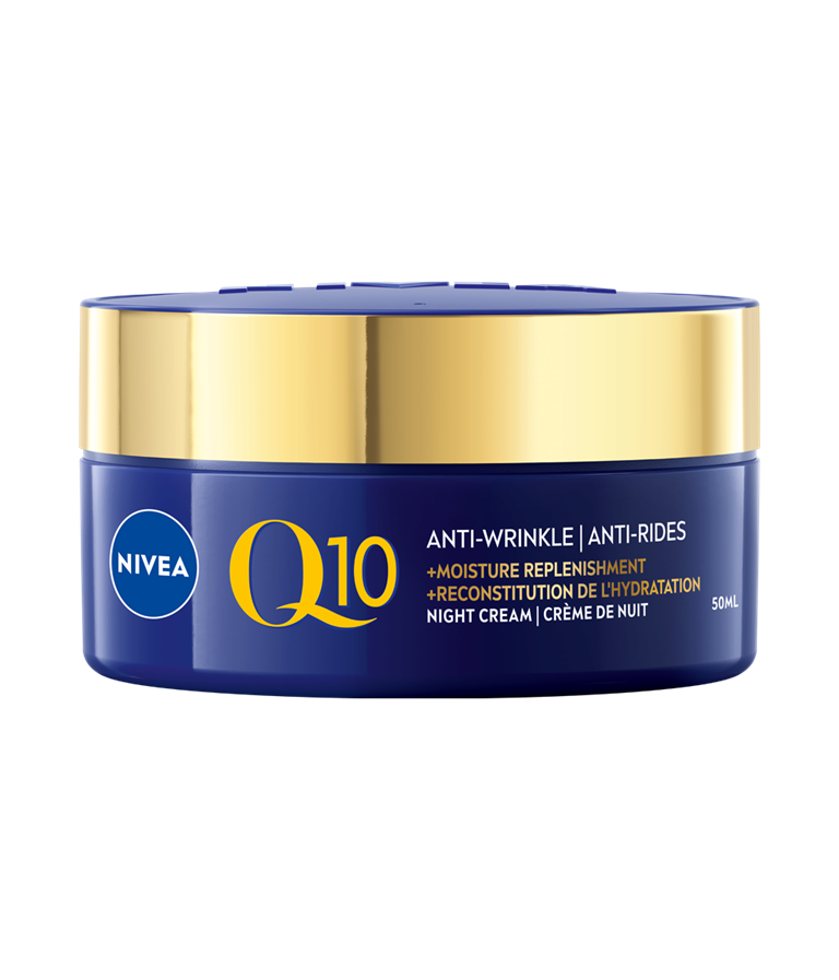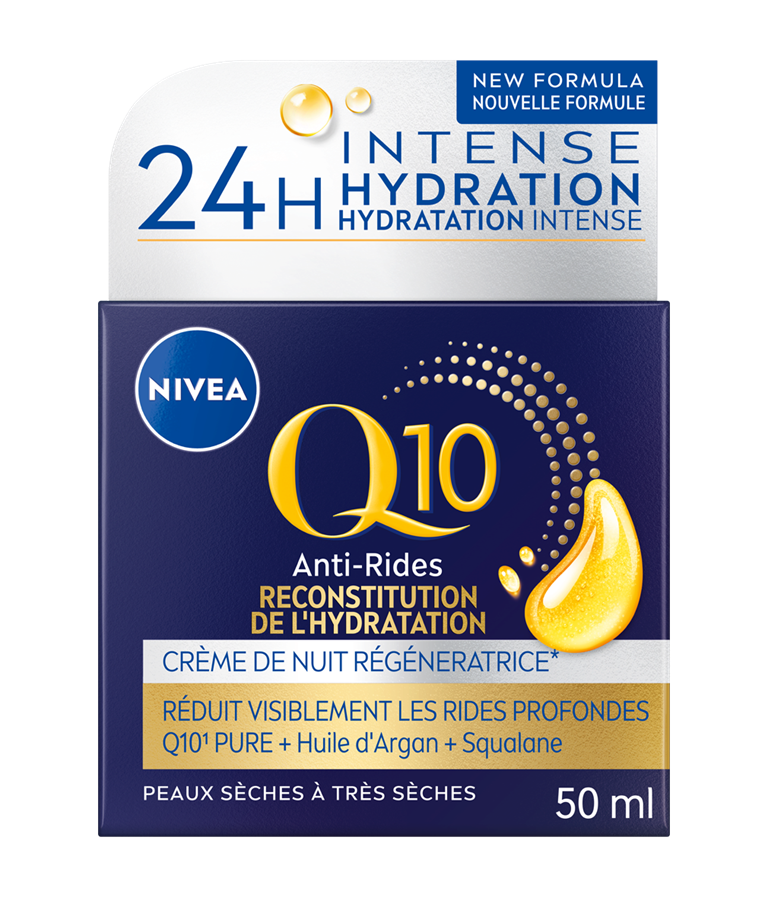 La CRÈME DE NUIT NIVEA Q10 RECONSTITUTION DE L’HYDRATATION nourrit intensément la peau tout au long de la nuit pour la réénergiser et lui donner une apparence plus jeune. Formulée avec de la coenzyme Q10 pure, de l’huile d’argan et de la squalane, elle procure une sensation de peau plus ferme en 2 semaines et aide à réduire l’apparence des rides profondes en 4 semaines.